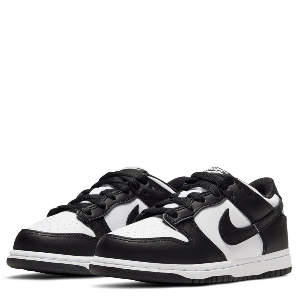 The Nike 'Panda' Dunk Low is an easy score for your kiddo's closet. This mid-`80s hoops icon returns with super-durable construction and original colors. Add in a rubber sole for traction and this one's a slam dunk for young sneakerheads. Real and synthetic leather are durable and add a classic feel. Collar and tongue construction pair with perforations on the toe to give these kicks an iconic look that's true to the original.